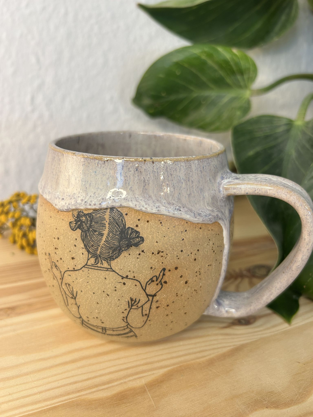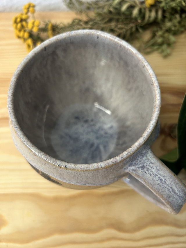 Tasse gedreht aus gespottetem Steinzeug, glasiert mit fliederfarbene Glasur. Verziert mit Unterglasurbildern.